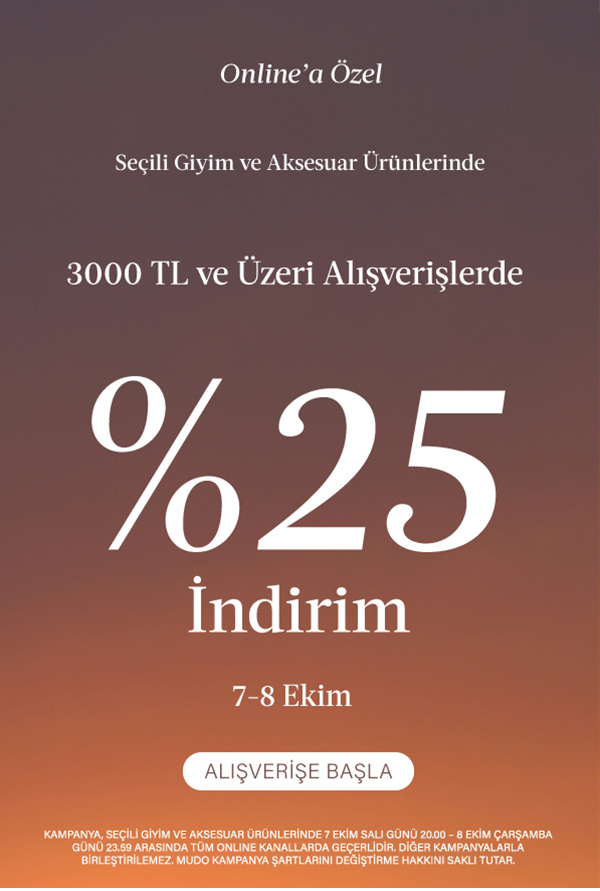 📣 Online'a Özel %25 İNDİRİM! Seçili Giyim ve Aksesuar Ürünlerinde 3000 TL ve Üzeri Alışverişlerde %25 İndirim Fırsatını Kaçırma.