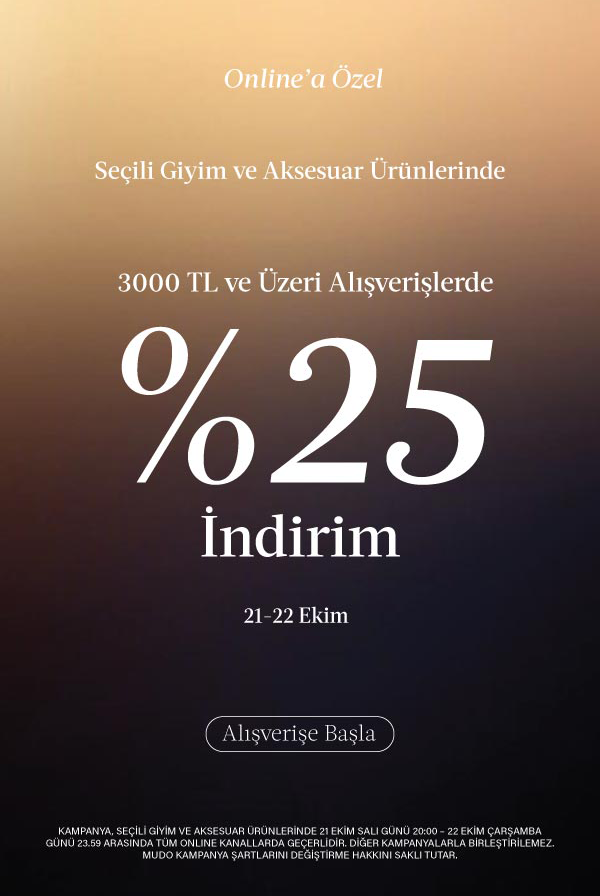 📣 Online'a Özel %25 İNDİRİM! Seçili Giyim ve Aksesuar Ürünlerinde 3000 TL ve Üzeri Alışverişlerde %25 İndirim Fırsatını Kaçırma.