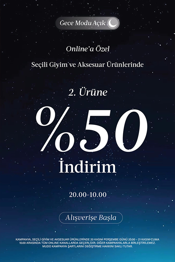 🔦 GECE MODU AÇIK! Online'a Özel %50 İNDİRİM! Seçili Giyim ve Aksesuar Ürünlerinde 2. Ürüne %50 İndirim Fırsatını Kaçırma.